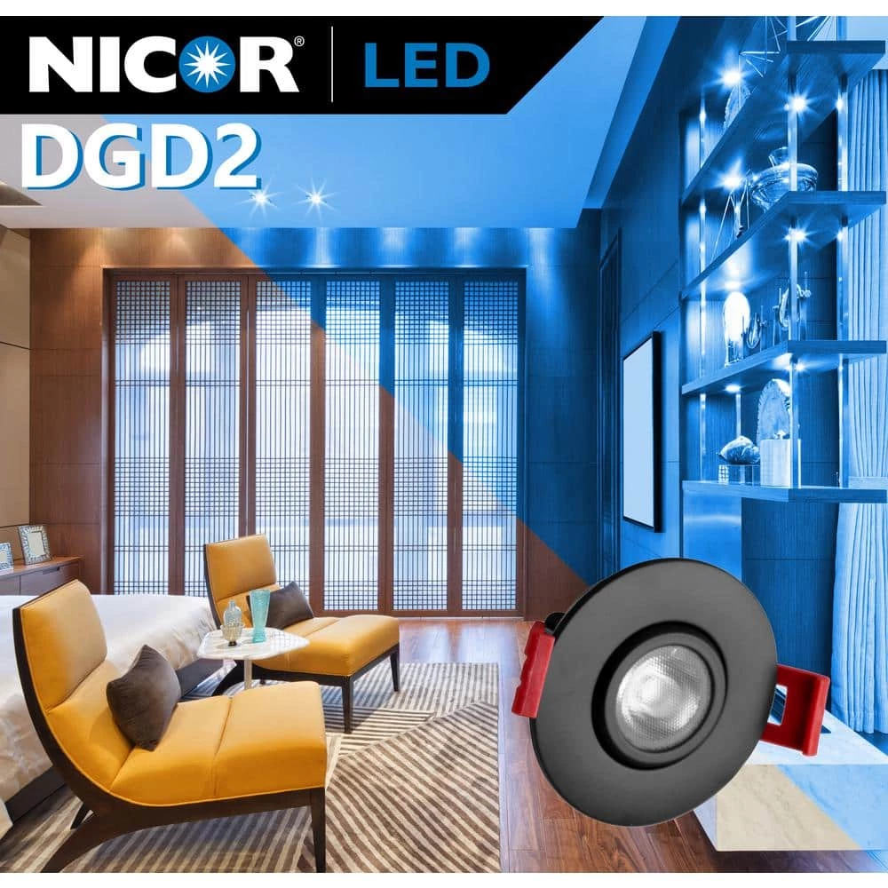 The DGD2 LED Downlight Gimbal features the latest in performance LED Downlight technology, designed to create an attractive visual aesthetic that’s incredibly easy to install. The high-performance DGD2 is Dimmable and features a 90 CRI rating, with an R9 value exceeding 50, making it one of the highest quality light fixtures on the market. Installation does NOT require a recessed housing or junction box, only a simple 2.125 in. in diameter cut-out in the ceiling using the provided template. The elegantly designed fixture and off-board driver (included) allows for a more flexible installation and an increased lifespan thanks to the superior heat management system separated from the LED module itself. The DGD2 features adjustable spring-loaded retention tabs for a secure fit, eliminating the need for a recessed housing or junction box. Adding an adjustable, multi-directional light system to highlight artwork or architectural design features in your home just got easier. Freedom from having to use a housing or junction box allows this light to be installed in places others simply cannot. Available in Black, Nickel, Oil-Rubbed Bronze and White. Choose from 2700K, 3000K, 4000K or 5000K Color Temperatures. The DGD2 is Energy Star rated, Insulation Contact rated (IC-rated), Title 24 Compliant, Damp-Location rated and is protected by NICOR’s 5-Year Limited Warranty.