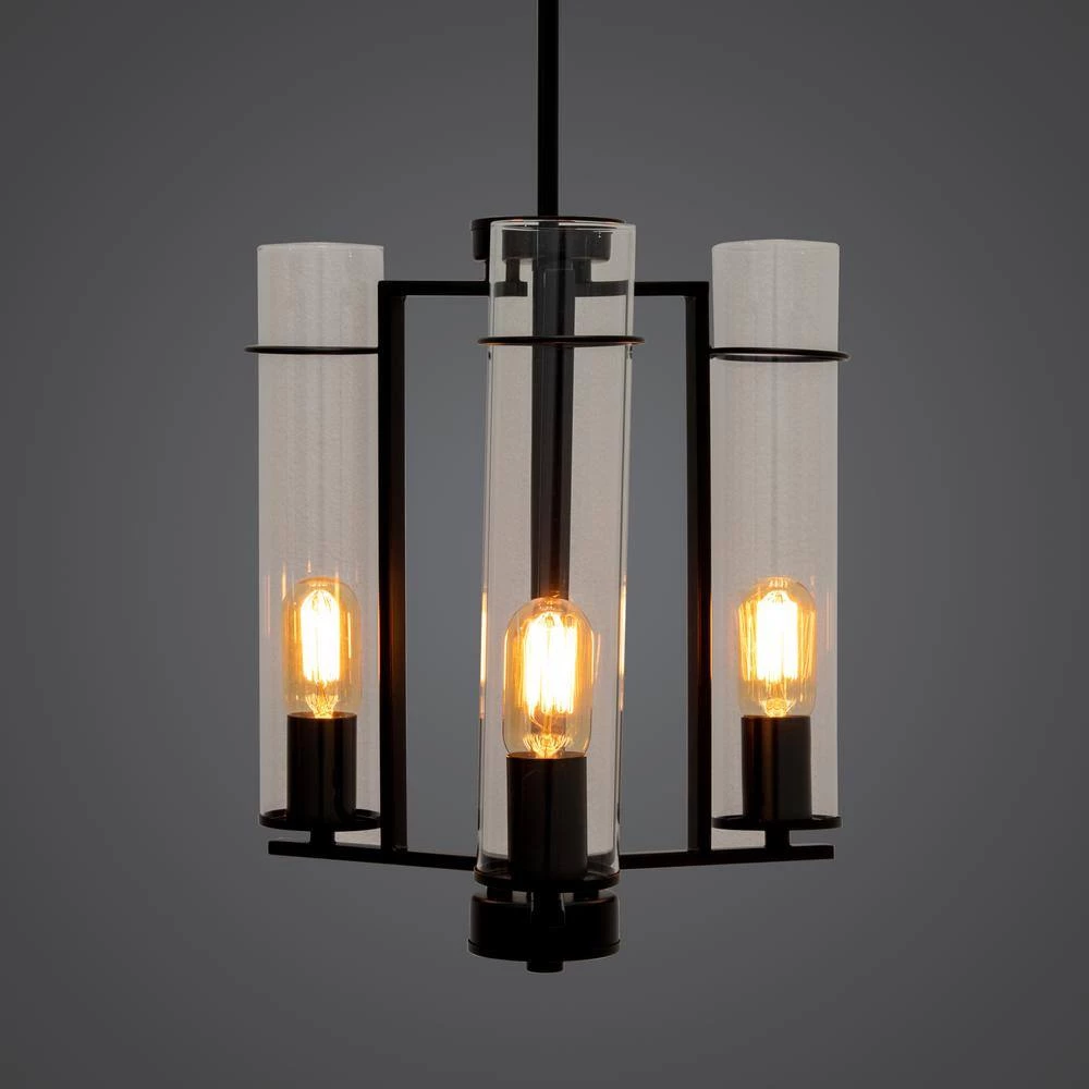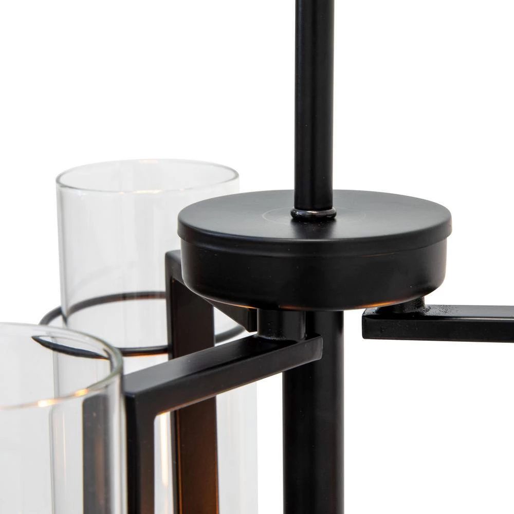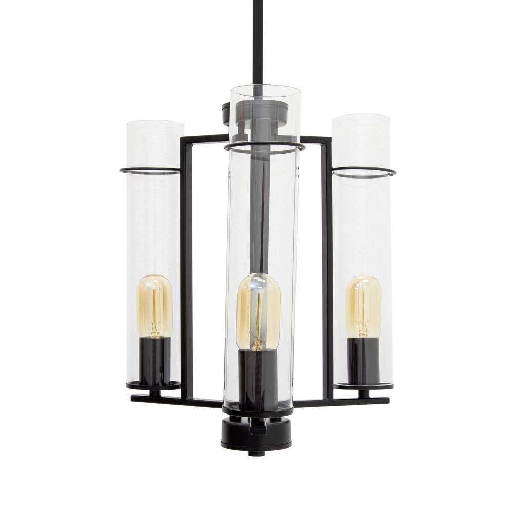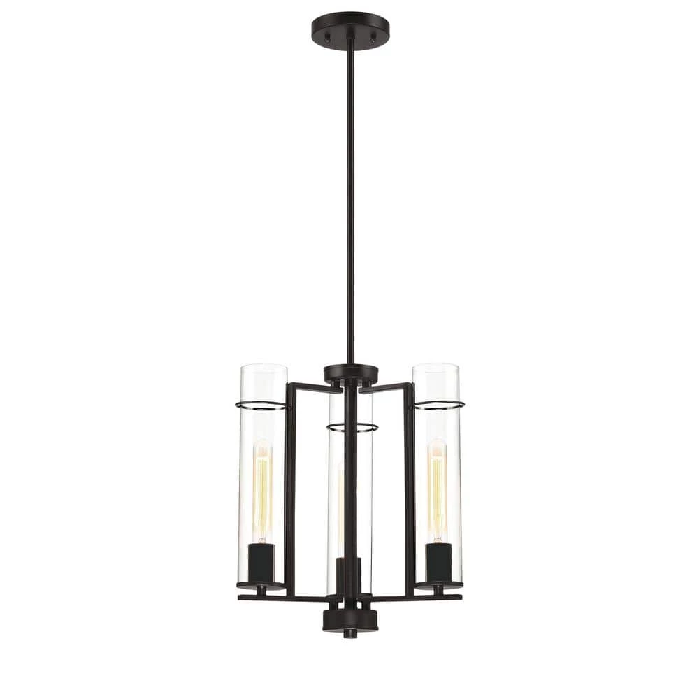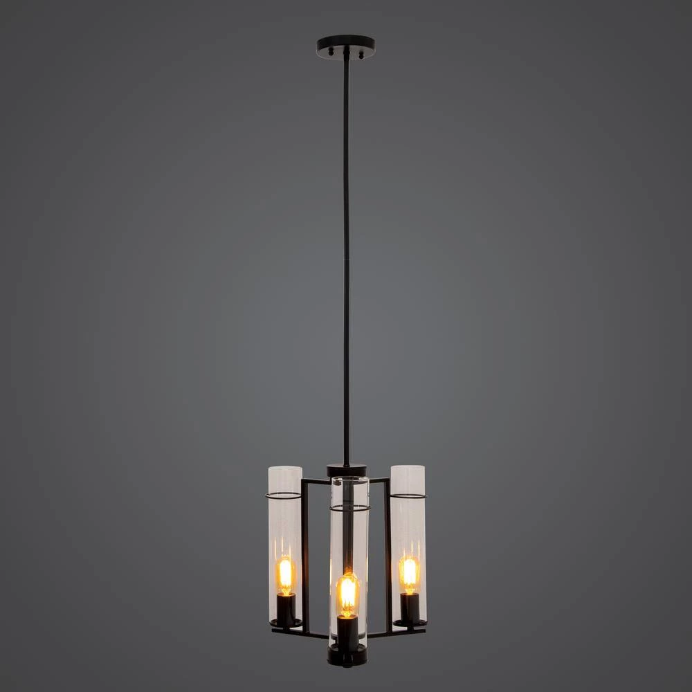 The Prairie Collection evokes a sense of strength and style. The matte black finish is a rich matte and the arms are comprised of long, rectangular links holding the piece together. The clear glass tubes adds a touch ofย elegance to the simplistic framework. The 10 ft. of chain and 12 ft. of wire enable this piece to be used in a wide variety of spaces Requires three 60-Watt bulbs Recommend using clear T bulbs.Not included. Maximum 105 in. H.Hanging weight 8 lbs. Clean with a dry soft cloth Use a non-abrasive glass cleaner.