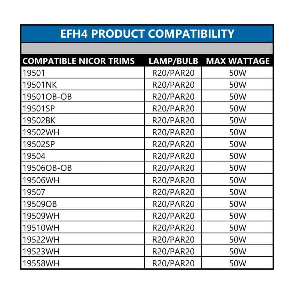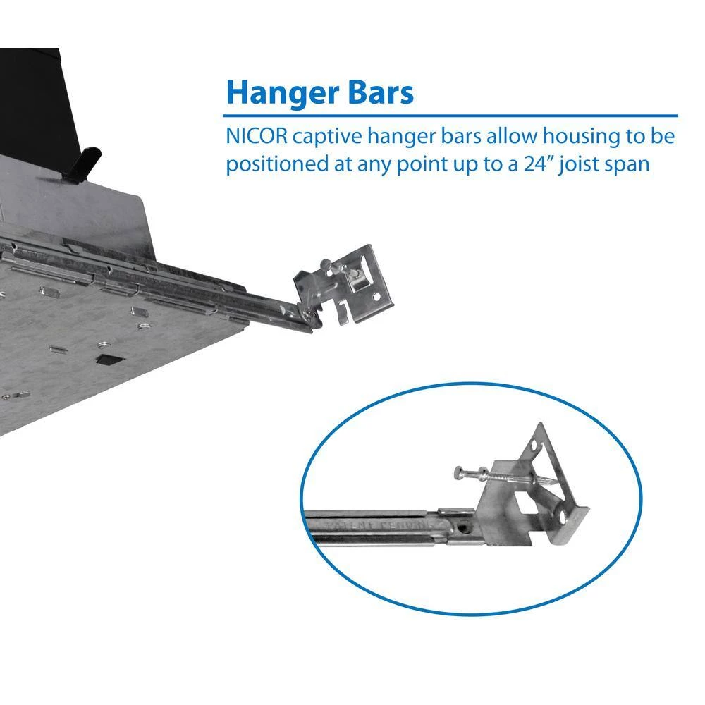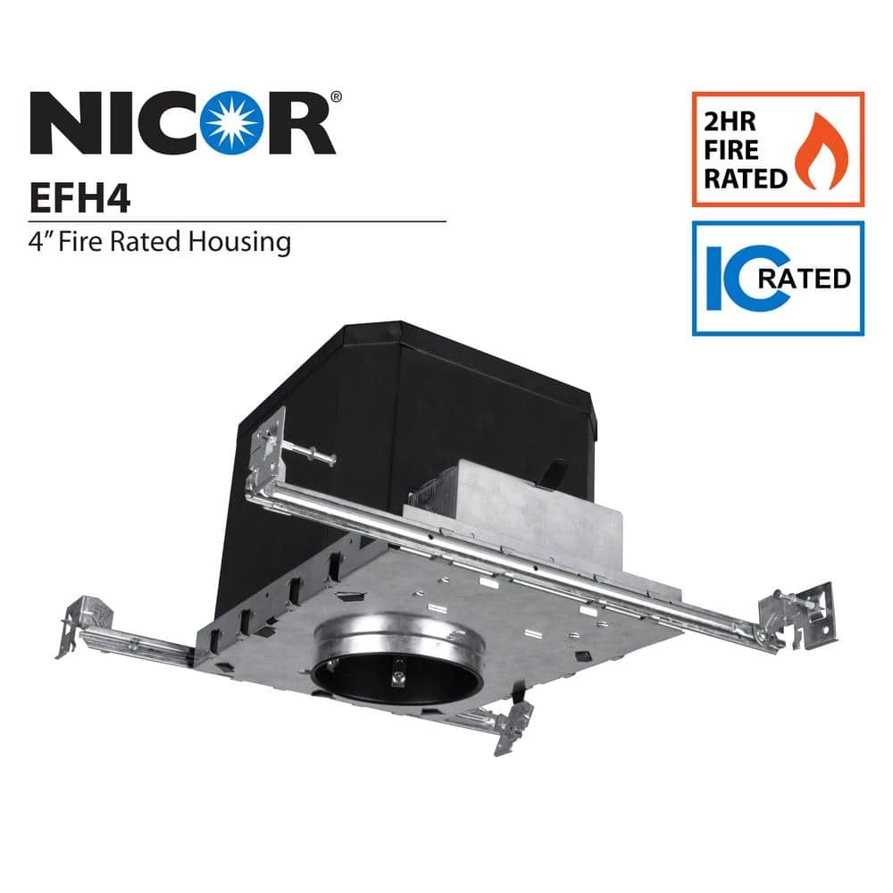 The NICOR EFH4 is a Fire Rated 4 in. Recessed Housing designed for new construction applications. The housing is UL Classified for a 2-hour Fire Rating. The durable double wall steel construction incorporates a non-combustible fiber insulation layer to block flames and gasses from entering the ceiling above. The insulation layer also acts as sound proofing to reduce the noise level passed between floors. The EFH4 is designed for standard 4 in. recessed downlights and trims. It also features an Edison (E26/E27) base for a quick connection to most LED downlights. This makes installation as easy as possible. The EFH4 housing is Insulation Contact Rated (IC-Rated), Airtight, and Wet-Location Rated when used with a Wet-Location Rated downlight or trim. This makes it the perfect housing for showers and bathrooms. It also keeps your home or office insulated and energy efficient. The EFH4 also features extendable hangar bars and end brackets (with pre-set nails) that swivel 90ยฐ during installation. This allows them to be affixed 1 side at a time. The EFH4 is designed for 120-Volt applications and includes a 1-Year Limited Warranty.