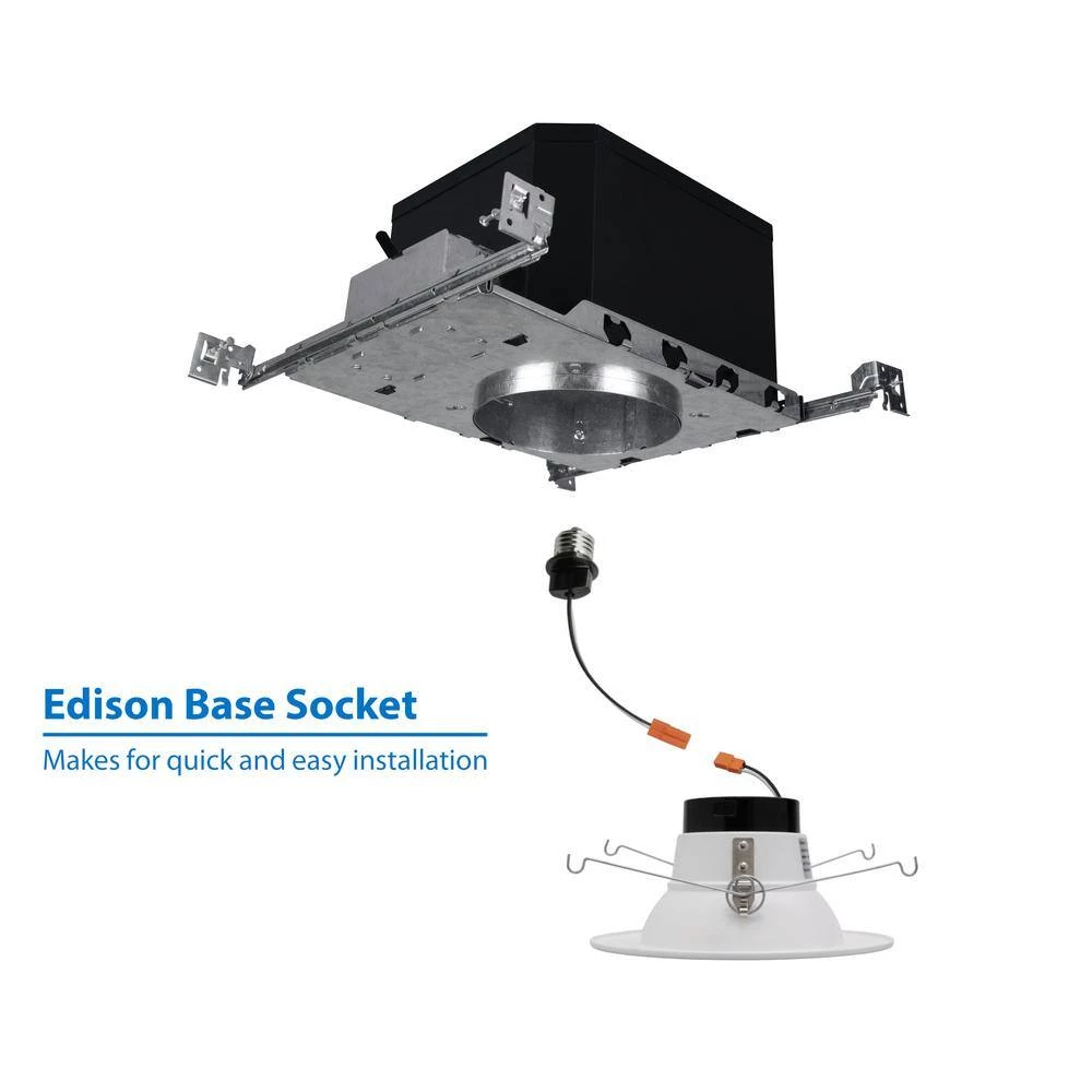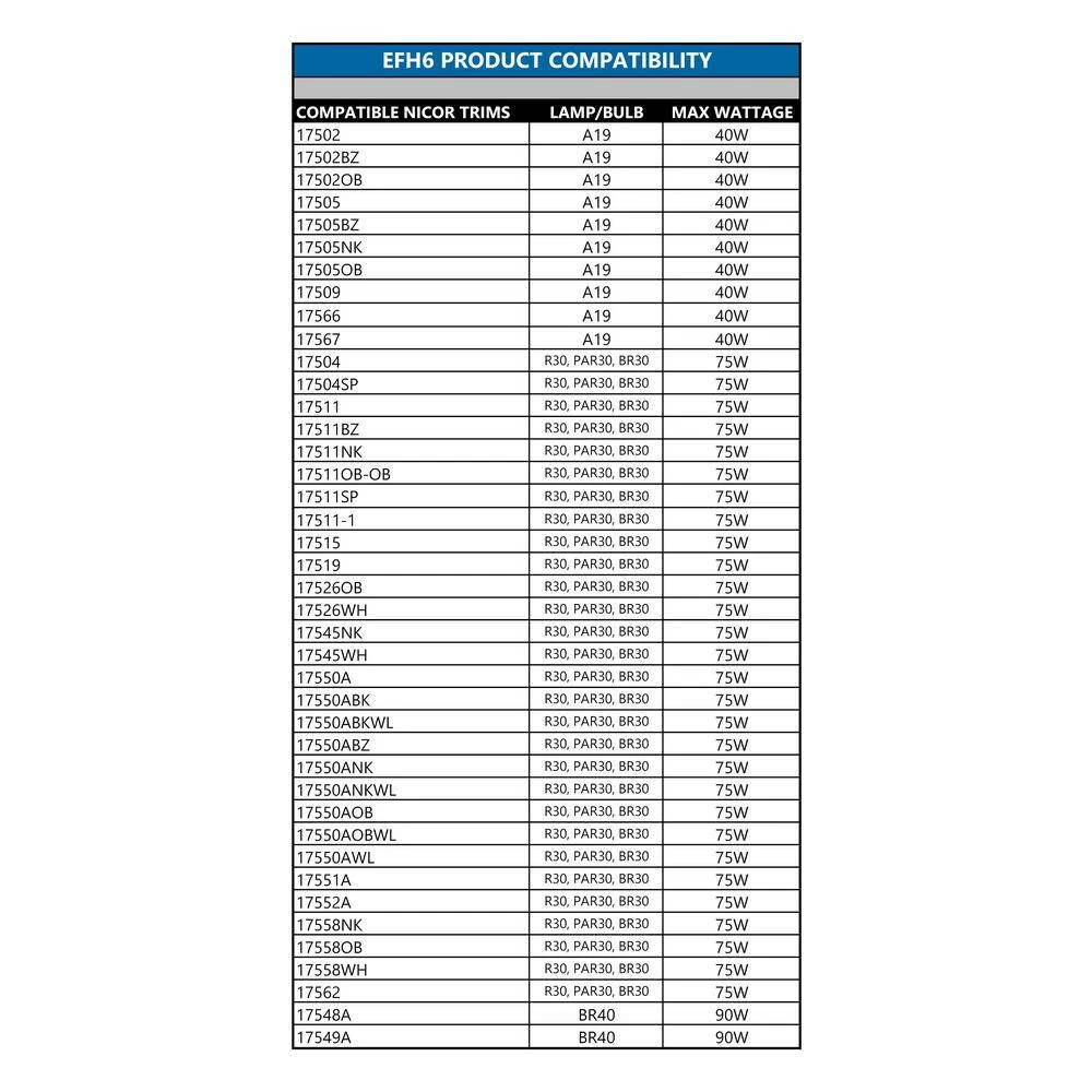 The NICOR EFH6 is a Fire Rated 6 in. Recessed Housing designed for new construction applications. The housing is UL Classified for a 2-hour Fire Rating. The durable double wall steel construction incorporates a non-combustible fiber insulation layer to block flames and gasses from entering the ceiling above. The insulation layer also acts as sound proofing to reduce the noise level passed between floors. The EFH6 is designed for standard 6 in. recessed downlights and trims. It also features an Edison (E26/E27) base for a quick connection to most LED downlights. This makes installation as easy as possible. The EFH6 housing is Insulation Contact Rated (IC-Rated), Airtight, and Wet-Location Rated when used with a Wet-Location Rated downlight or trim. This makes it the perfect housing for showers and bathrooms. It also keeps your home or office insulated and energy efficient. The EFH6 also features extendable hangar bars and end brackets (with pre-set nails) that swivel 90° during installation. This allows them to be affixed 1 side at a time. The EFH6 is designed for 120-Volt applications and includes a 1-Year Limited Warranty.