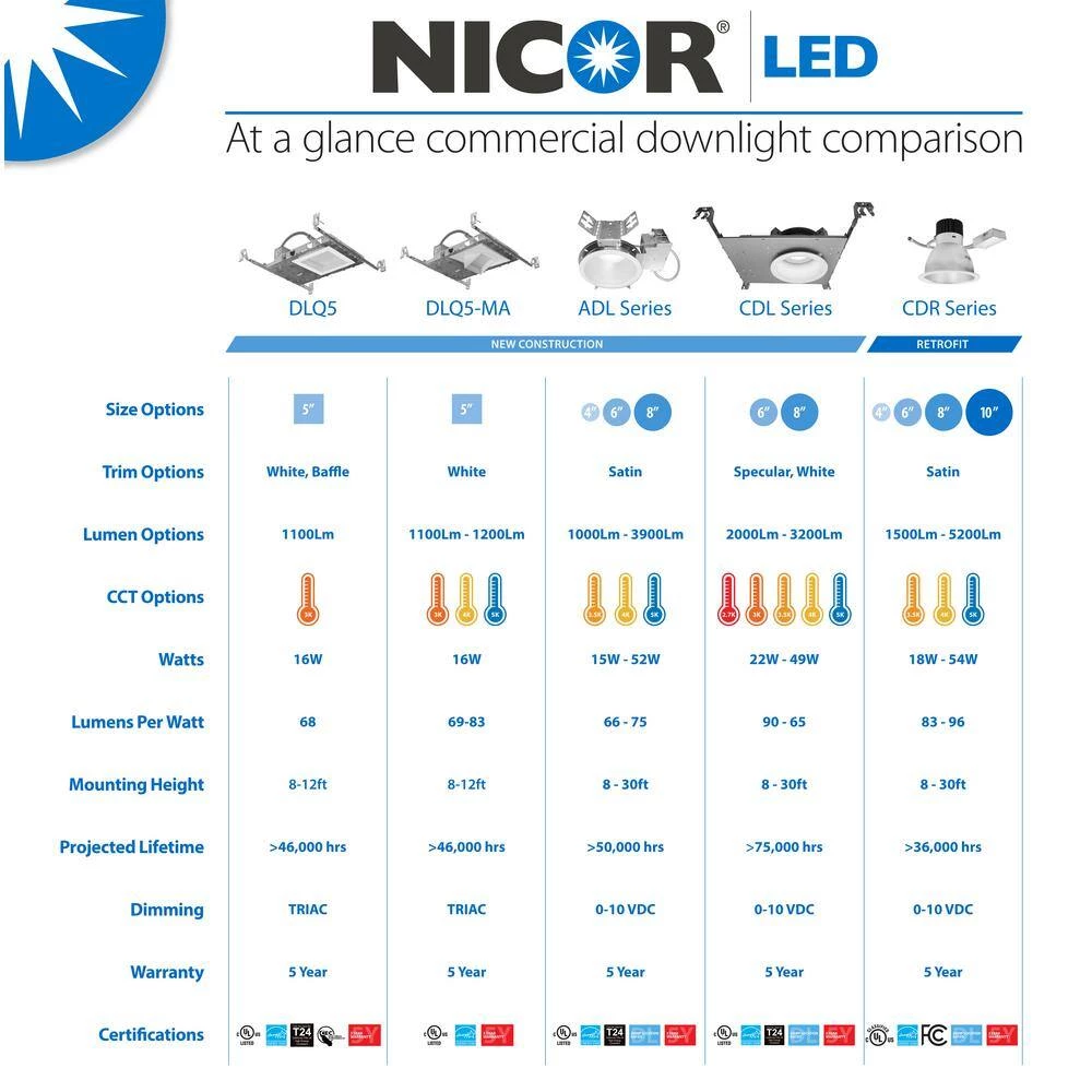 NICOR’s ADL Series Architectural Commercial Downlights combine energy efficiency with environmental responsibility. The ADL features a 2-part system consisting of the steel frame housing and the LED downlight module. This allows the lighter frame to be installed first, and the downlight module to be added afterwards. The external driver keeps heat away from the LED components to ensure consistent performance and a long lifespan. The ADL is Insulation Contact rated (IC-rated) and perfect for new construction or retrofit applications in commercial or residential settings. The high-performance LED’s feature a high CRI rating with multiple color temperature options available. The ADL is also available in 4 in., 6 in., and 8 in. sizes, each available in different lumen outputs to suit any project. The ADL downlight is ENERGY STAR rated and Damp-Location rated. Each system is ready to install right out of the box. No other parts or components required. Protected by NICOR’s 5-year limited warranty.