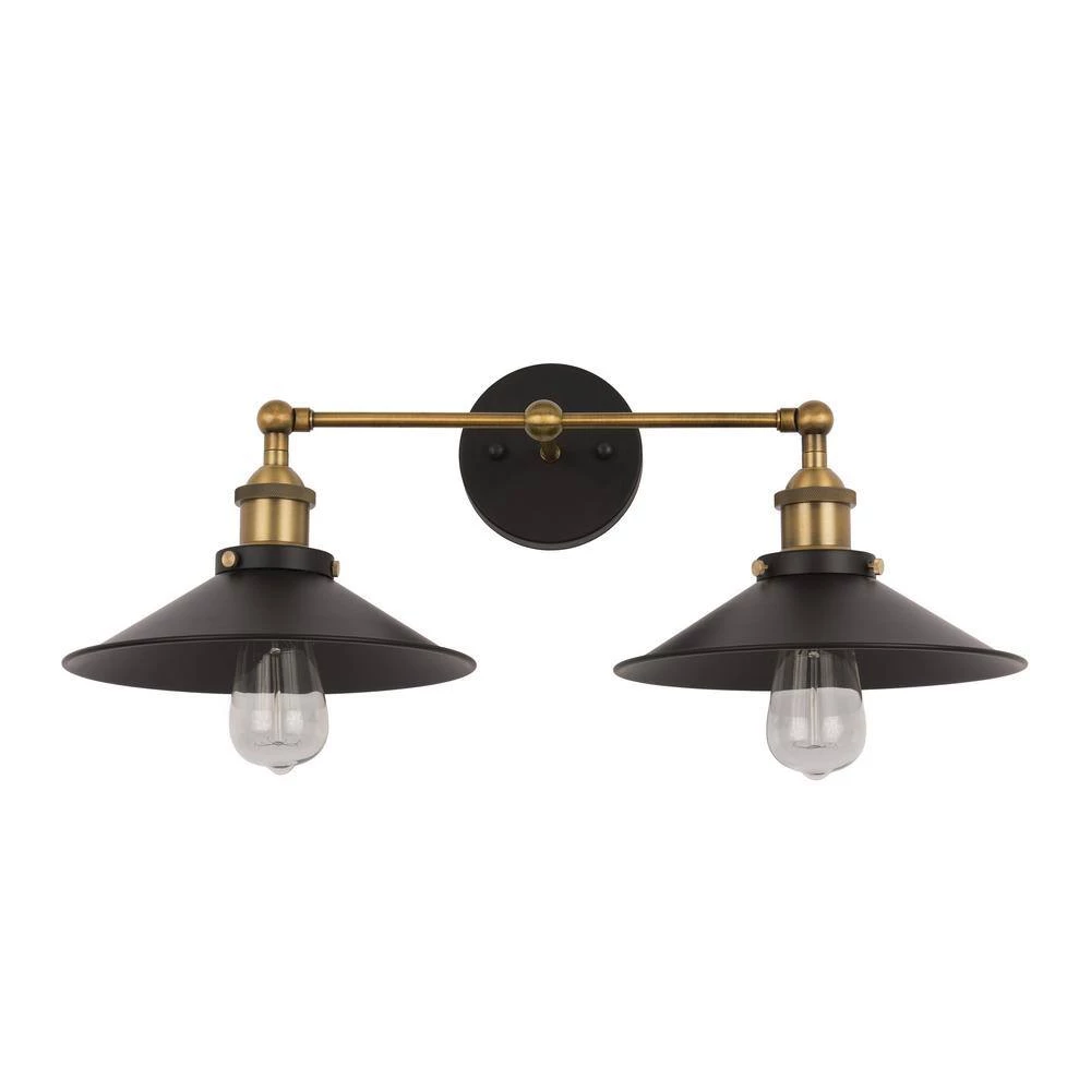 The Aharon Sconce by Yosemite Home Decor features an industrial inspired light fixture. The 2-light wall sconce is featured in a dark grey finish with copper hardware with a clear glass shade. This fixture is functional and stylish. This fixture is great for homes or offices looking to add a touch of flare.