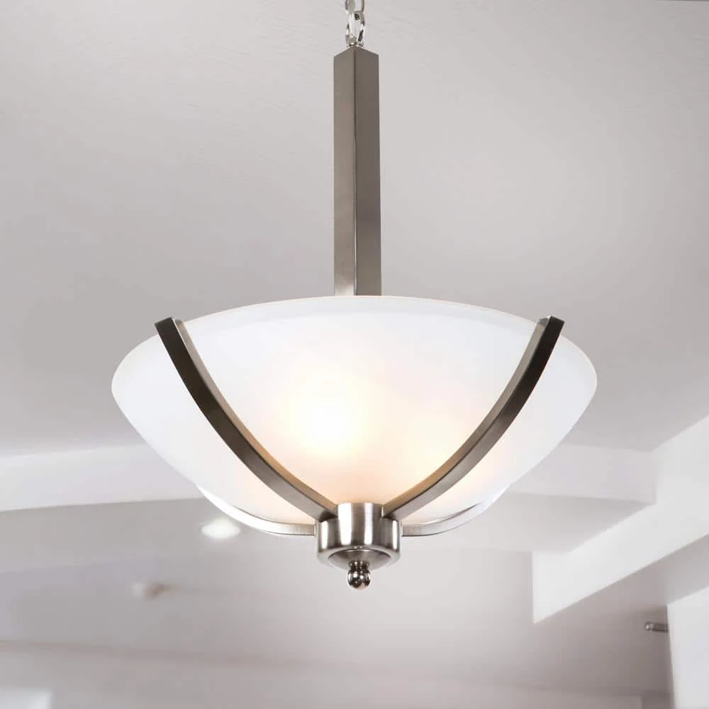 Update your foyer or the entry way into your home with this beautiful 3-light chandelier from the Alta Peak collection by Yosemite Home Decor. Item code #107-3B-16AWSS, this stunning chandelier is finished in a crisp Satin Steel finish with an Acid Washed bowl glass shade. It comes equipped with 4 ft. of chain and 10 ft. of wire so that you can hang it a desired height. It requires (3) incandescent medium (E26) base bulbs at a maximum of 100-Watt. This chandelier would add simple elegance to your home and blend well with any decor. A 1-year limited warranty is included at the time of purchase for the parts. Its dimensions are 21 in. H x 16 in. W x 16 in. D and weighs 8.38 lbs. Also available in a Coffee brown finish.