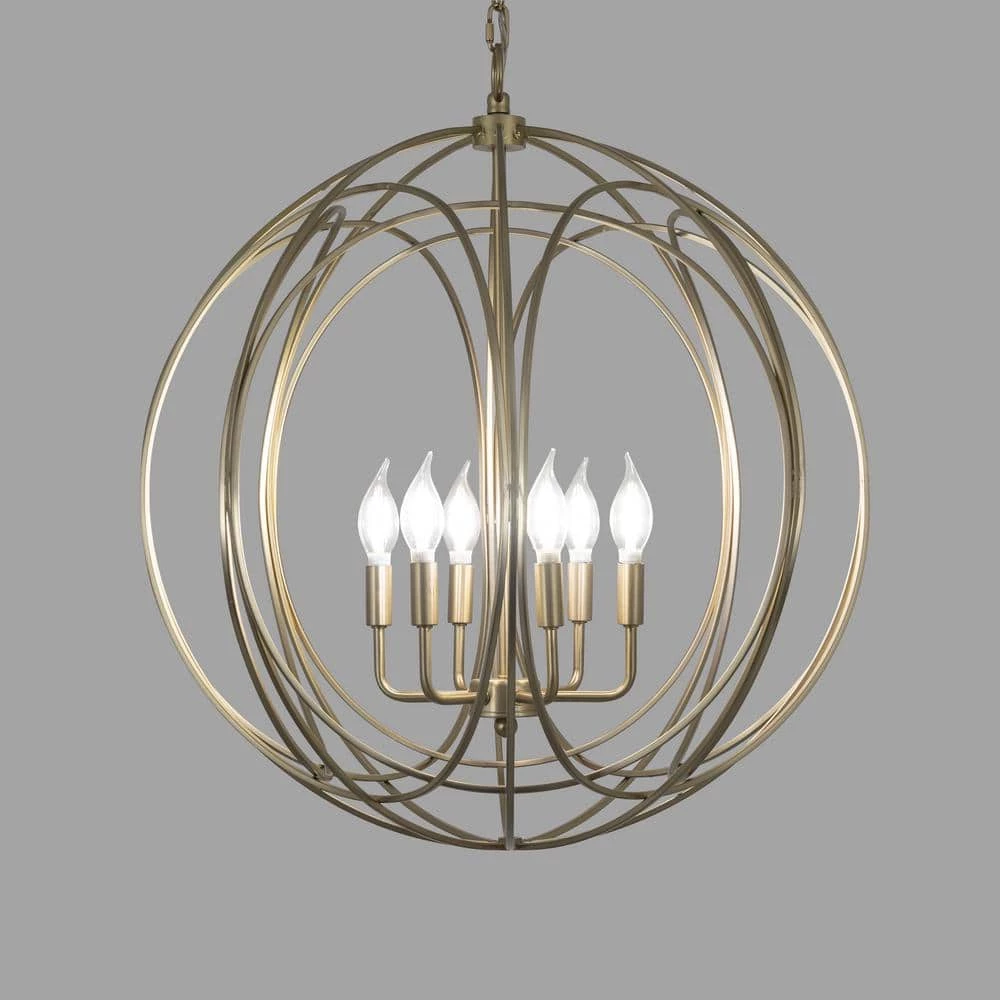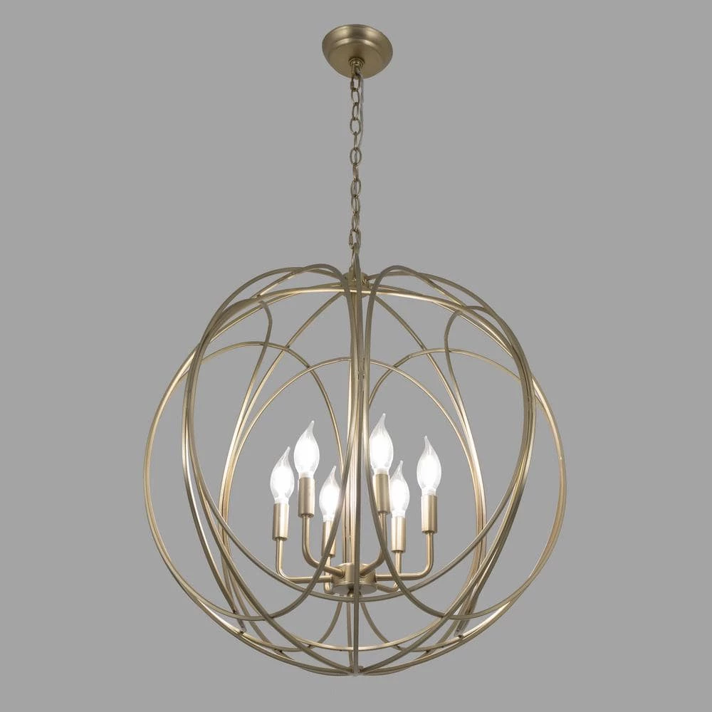The 6-Light Chandelier in Satin Brass Finish by Yosemite Home Decor will add modernity and elegance to any space. Both functional and fascinating, this chandelier will add a bright and unique touch to your home. A six-light candelabra hangs inside the globe. The brass finish and exclusive design makes this chandelier striking and beautiful.
