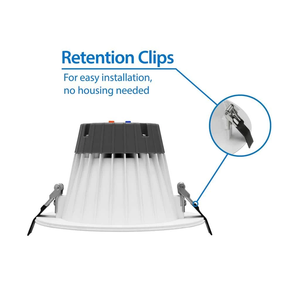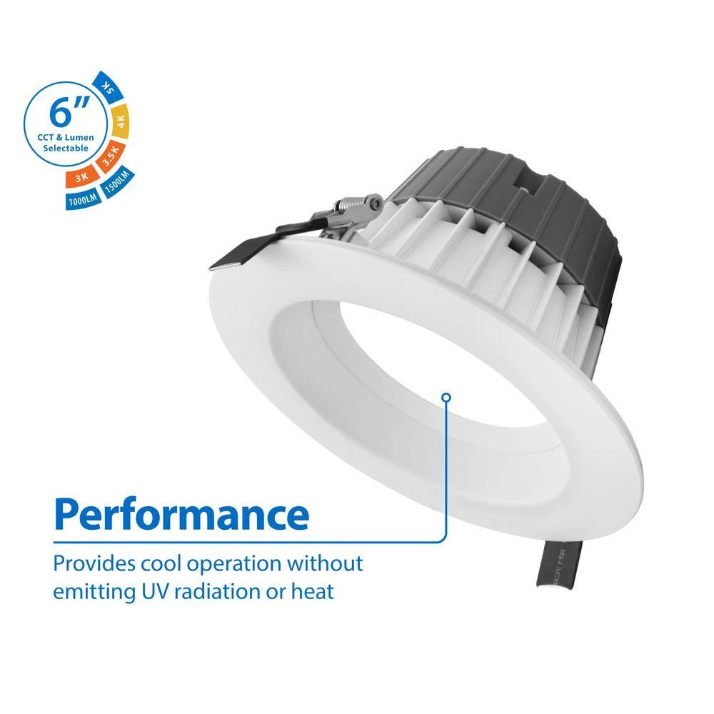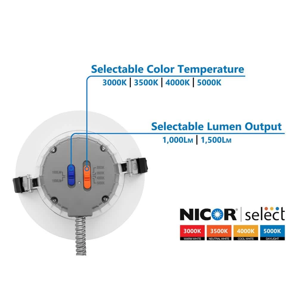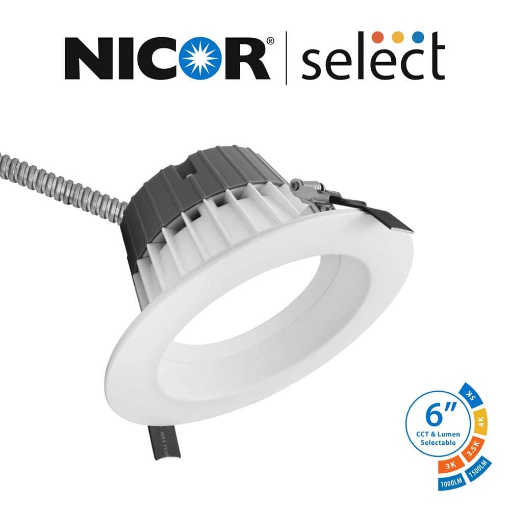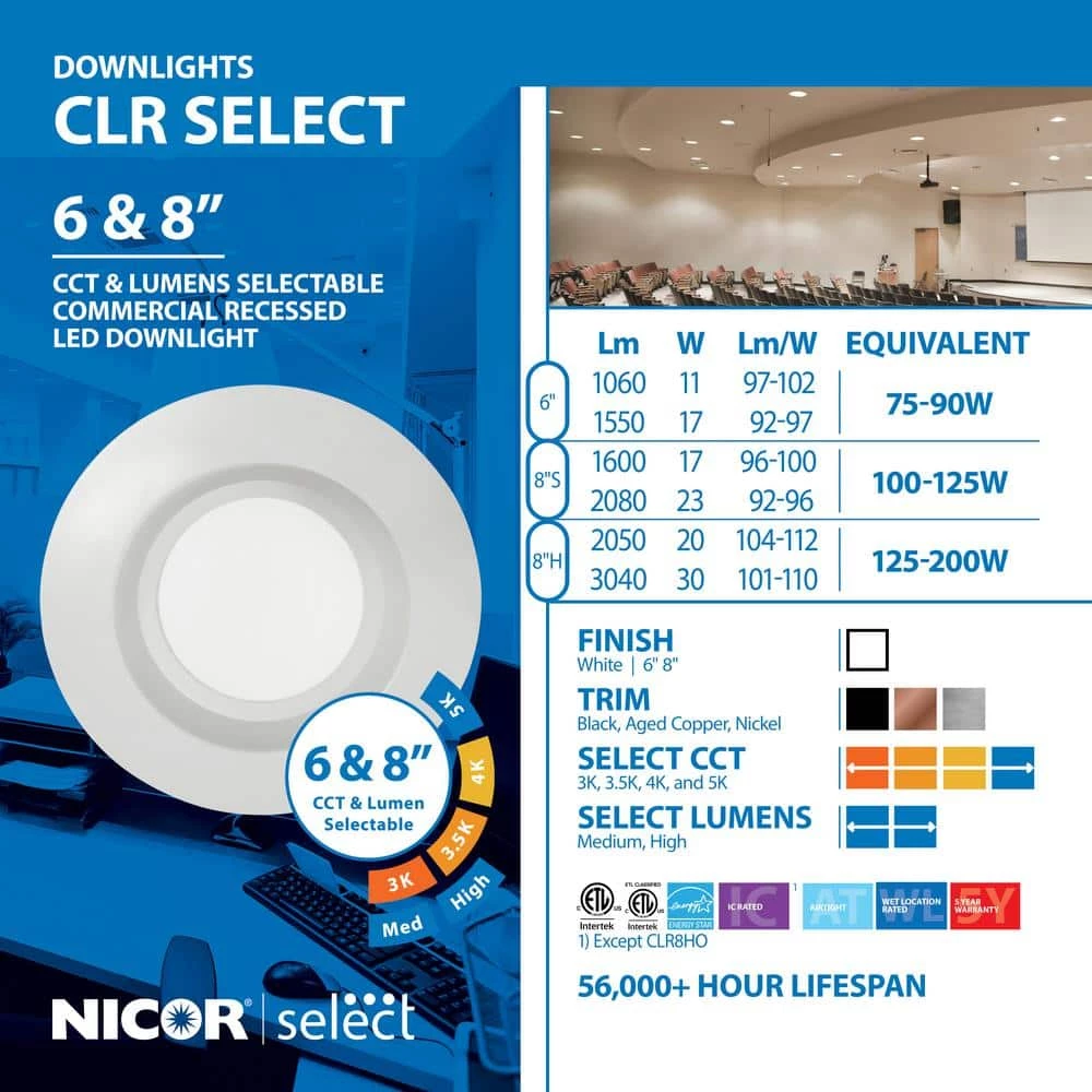 The NICOR CLR6-SELECT series is a 6 in. recessed LED downlight built to commercial grade specifications. The canless design of the CLR6-SELECT allows for incredibly easy installation directly into drywall, ceiling grids and existing mounting frames. Installation no longer requires a recessed housing, but rather a simple circular cut-out in the ceiling. The high-performance CLR6-SELECT features a switch on the back to select between 3000K, 3500K, 4000K and 5000K color temperatures. The built-in driver requires less wiring while increasing the product lifespan through superior heat management. The CLR6-SELECT is also wet-location rated, airtight and insulation contact rated (IC-rated). It features full-range dimming (0-Volt-10-Volt DC) and uses 120-Volt-347-Volt. In short, it’s the most versatile and complete commercial downlight system to date. It can be installed anywhere and in any setting. Available in Black, Nickel, Aged Copper and White. The CLR6-SELECT is protected by NICOR’s 5-year limited warranty.