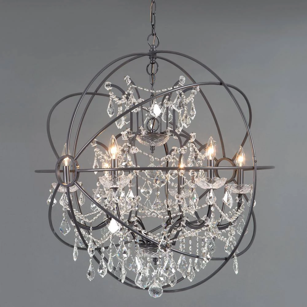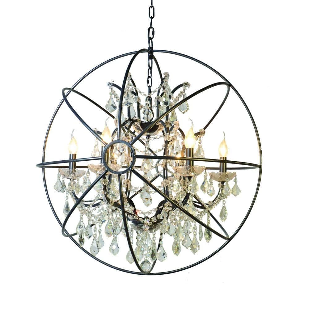 Yosemite Home Decor presents a series of chandeliers from the Contessa Collection. This chandelier is constructed of iron with an intertwining spherical frame encasing a dazzling 6-light chandelier adorned with clear crystals. This chandelier is elegantly finished in matte black. Perfect for dining rooms and entry ways, it comes equipped with wire and chain for versatility in hanging options.