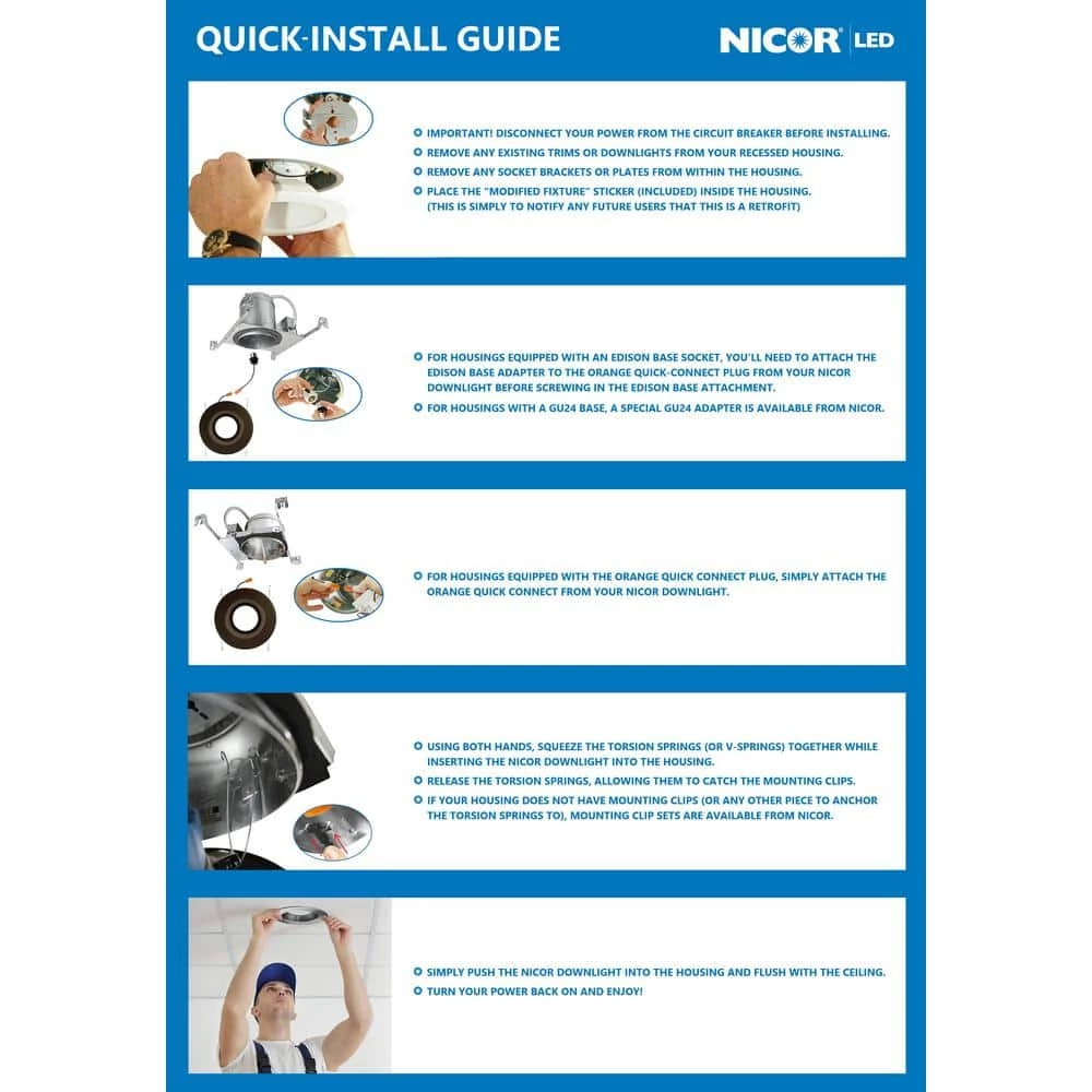 The DCG6 LED Gimbal Downlight is an economical, easy-to-install retrofit that’s perfect for upgrading to LED lighting from incandescent of fluorescent lighting. The easy twist-and-tilt directional lighting system allows for 360 rotation and 35 tilt to highlight artwork or architectural design features in your home. The DCG6 provides an energy efficient solution, designed to create an attractive visual aesthetic that’s incredibly easy to install. The DCG6 is Dimmable (down to 5%) and features a 93 CRI rating, with an R9 value of 59, making it a contender among the highest quality light fixtures on the market. The DCG6 features dual torsion springs for a secure fit into any 6 in. recessed housing. Installs using an Edison base adapter or quick-connect (orange) cable, both of which are included. Choose from 2700K, 3000K, 4000K, or 5000K Color Temperatures. The DCG6 is ENERGY STAR rated, Title 24 compliant, Damp-Location rated, and protected by NICOR’s 5-Year Limited Warranty.