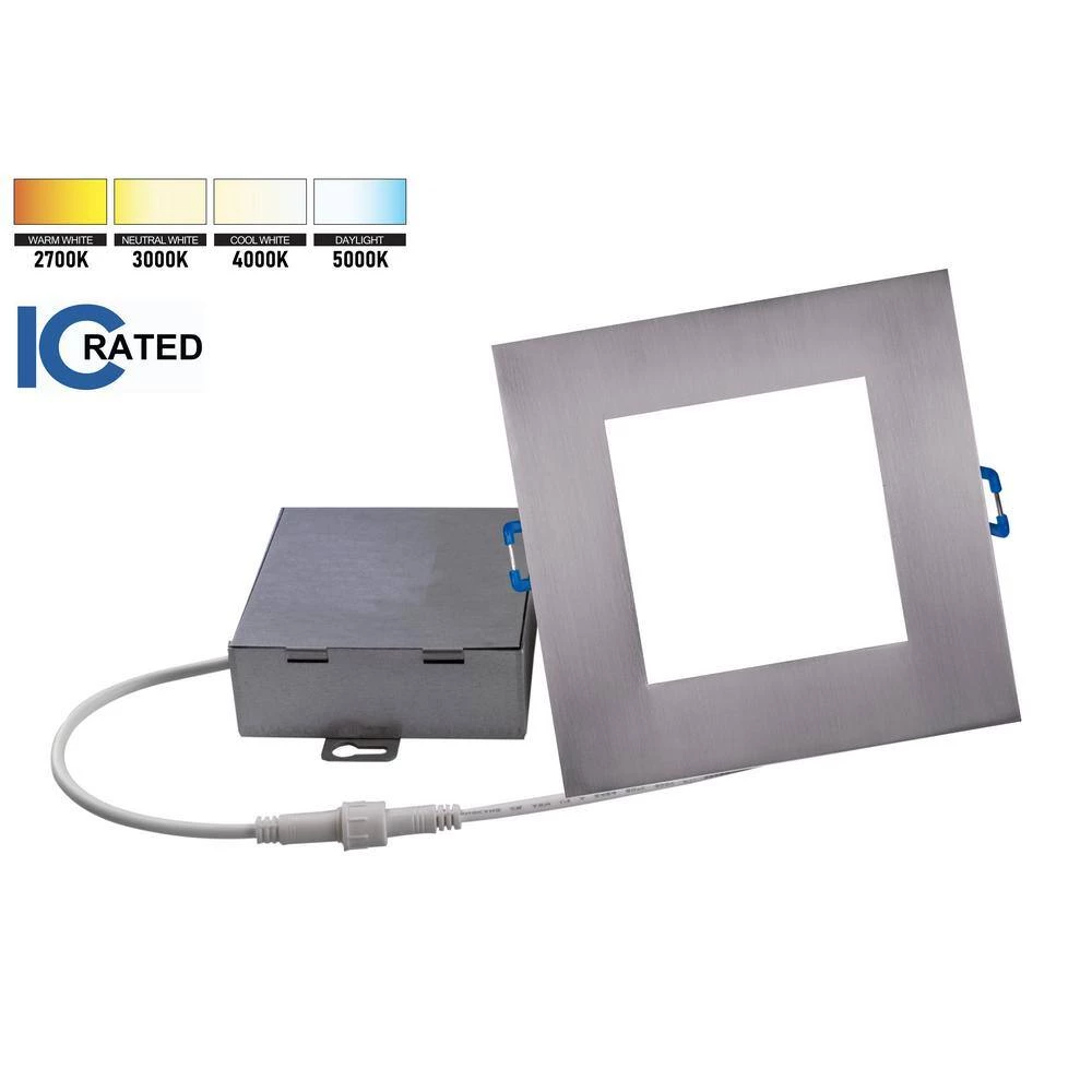 The DLE4 Edge Lit 4 in. Square LED Downlight creates an attractive visual aesthetic with a low profile that’s incredibly easy to install. The edge-lit technology uses a reflective light guide panel that disperses light through a diffused lens, making it a practical, economical, and energy efficient solution for lighting your home or office. This high-performance downlight features 93 CRI, with an R9 value exceeding 50, making the DLE4 among the highest rated LED light fixtures in terms of light output quality. Installation no longer requires a recessed housing, but rather a simple 4.25 in. in diameter cut-out in the ceiling using the provided template. The ultra-thin fixture depth (less than 1 in.) and off-board driver (included) allows for a more flexible installation and increased lifespan with superior heat management. The DLE4 features adjustable spring-loaded retention tabs for a secure fit, eliminating the need for a J-box or recessed housing. Adding light in tight spaces such as living rooms, hallways, bathrooms, basements, entryways, porches, and utility closets just got easier. The DLE4 is Title 24 Compliant (except 5000K version), ENERGY STAR rated, Insulation Contact rated (IC-rated), Airtight, Damp-location rated, and protected by NICOR’s 5-Year Limited Warranty. The DLE4 comes ready to install and use right out of the box, no other components are required.