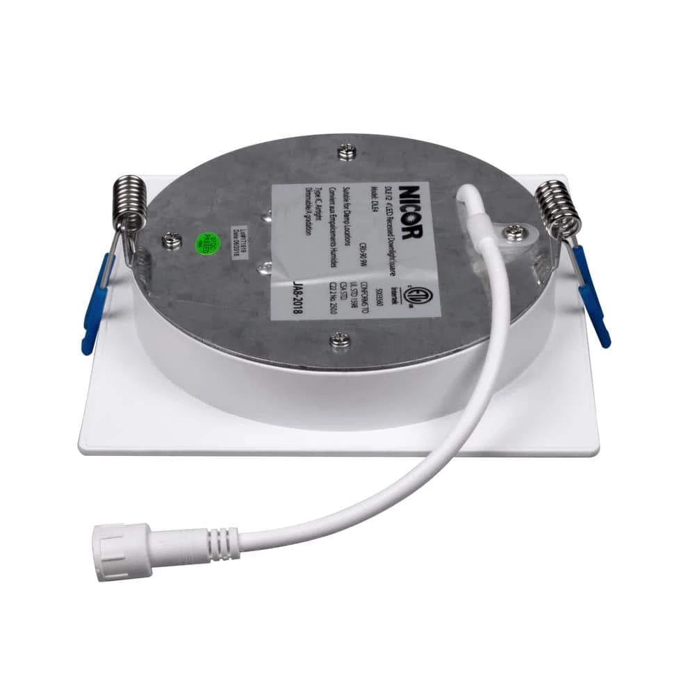 The DLE4 Edge Lit 4 in. Square LED Downlight creates an attractive visual aesthetic with a low profile that’s incredibly easy to install. The edge-lit technology uses a reflective light guide panel that disperses light through a diffused lens, making it a practical, economical, and energy efficient solution for lighting your home or office. This high-performance downlight features 93 CRI, with an R9 value exceeding 50, making the DLE4 among the highest rated LED light fixtures in terms of light output quality. Installation no longer requires a recessed housing, but rather a simple 4.25 in. in diameter cut-out in the ceiling using the provided template. The ultra-thin fixture depth (less than 1 in.) and off-board driver (included) allows for a more flexible installation and increased lifespan with superior heat management. The DLE4 features adjustable spring-loaded retention tabs for a secure fit, eliminating the need for a J-box or recessed housing. Adding light in tight spaces such as living rooms, hallways, bathrooms, basements, entryways, porches, and utility closets just got easier. The DLE4 is Title 24 Compliant (except 5000K version), ENERGY STAR rated, Insulation Contact rated (IC-rated), Airtight, Damp-location rated, and protected by NICOR’s 5-Year Limited Warranty. The DLE4 comes ready to install and use right out of the box, no other components are required.