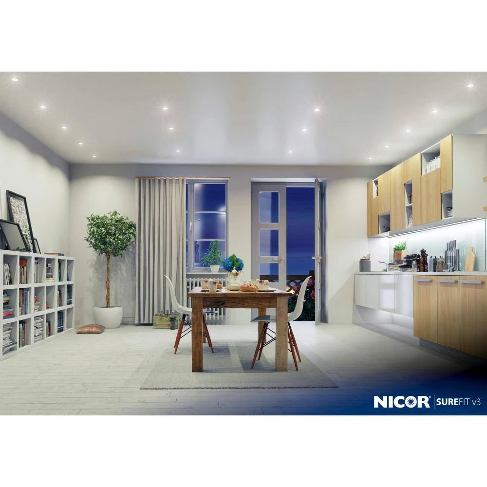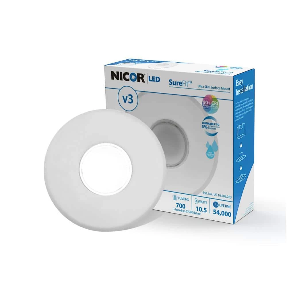 NICOR’s newest generation of the DLF SureFit downlight features an ultra-slim profile with the latest LED technology to improve color rendering, brightness and efficiency. with NICOR’s patented design, easily replace your old flush mount ceiling light without cutting new holes or installing new equipment. Using the included hardware, simply connect the wires to each of the 3 poke-in connectors and mount the fixture directly to any junction box (j-box). The SureFit downlight series is available in multiple color temperatures ranging from warm white to daylight and many trim options to match any decor. SureFit features a tested lifespan of over 54,000-hours backed by NICOR’s 5-Year Limited Warranty. for a truly customized look with a simple retrofit installation, look no further than the DLF SureFit.
