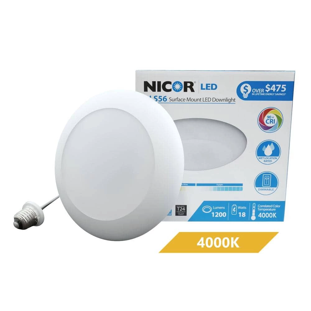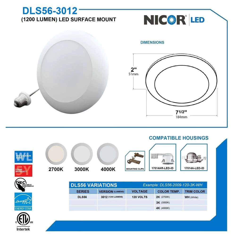 The DLS56 Surface Mount Retrofit Downlight can be installed into a 5 in. housing, 6 in. housing, or 4/0 Junction Box. Simply remove the twist lock diffuser and set your included captive screws. It’s that quick. The DLS56 downlight can be installed directly into 5 in. and 6 in. recessed housings using the includes friction mounting clips. The DLS56 with Integrated LED Driver is a very flexible lighting solution for both retrofit and new construction applications alike. The high performance DLS56 is available in 2700K, 3000K or 4000K color temperature, and features the latest technology in LED lighting to deliver the highest quality of light to produce 94 CRI and an R9 rating of 62. The DLS56 is also dimmable to 10%, and Wet Location Rated for use in Showers. Also Energy Star Rated, Title 24 Compliant, and features a 5 Year Warranty.