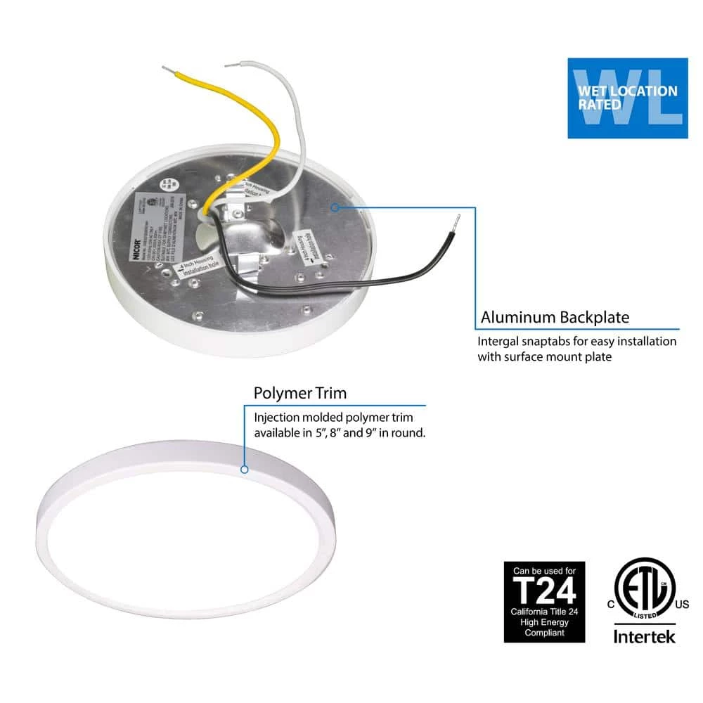 The DSE5 Round LED Surface Mount Downlight features the latest in LED technology to make installation as easy as possible. The slim profile downlight utilizes edge-lit technology with a reflective guide panel to disperse light evenly across the face of the diffuser, making this an efficient fixture with high performance output. The driverless technology allows the DSE5 to be installed in a 4 in. junction box and snapped into place with the integrated snap tabs on the back of the fixture. The DSE5 produces incredible color accuracy (at 93 CRI) and flexible dimming, compatible with standard LED dimmers. The narrow injection molded polymer housing with matte white finish creates the perfect design aesthetic for a modern look. With a calculated lifespan of over 54,000-hours, accompanied by an industry best 5-year limited warranty, the DSE5 delivers quality and durability for years to come. The ENERGY STAR rated DSE5 is available in 2700K, 3000K, 4000K, and 5000K color temperatures.