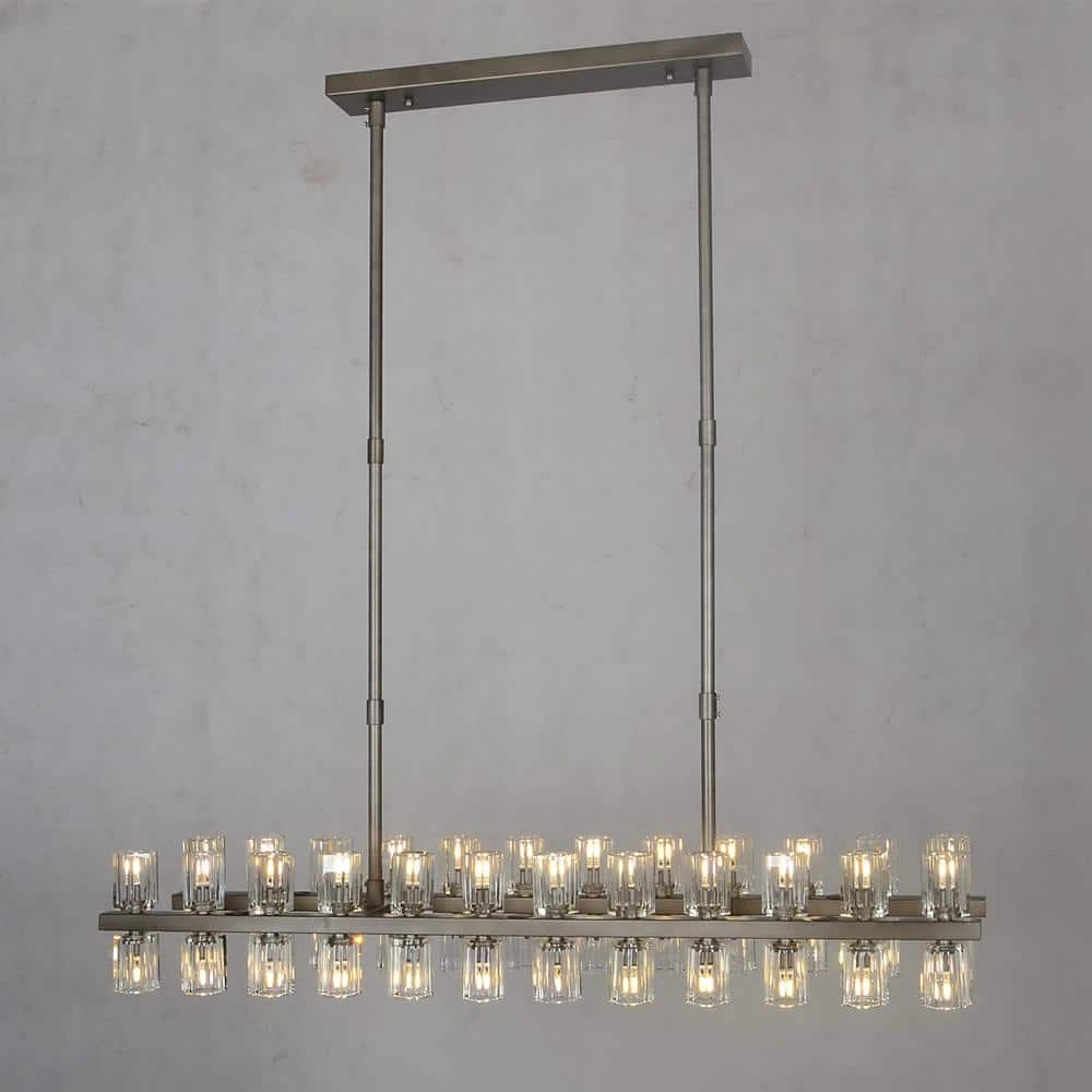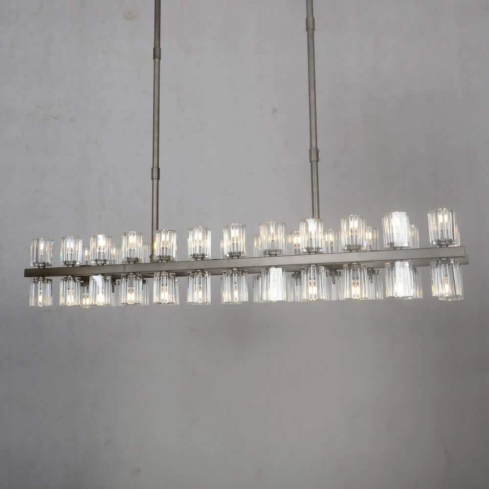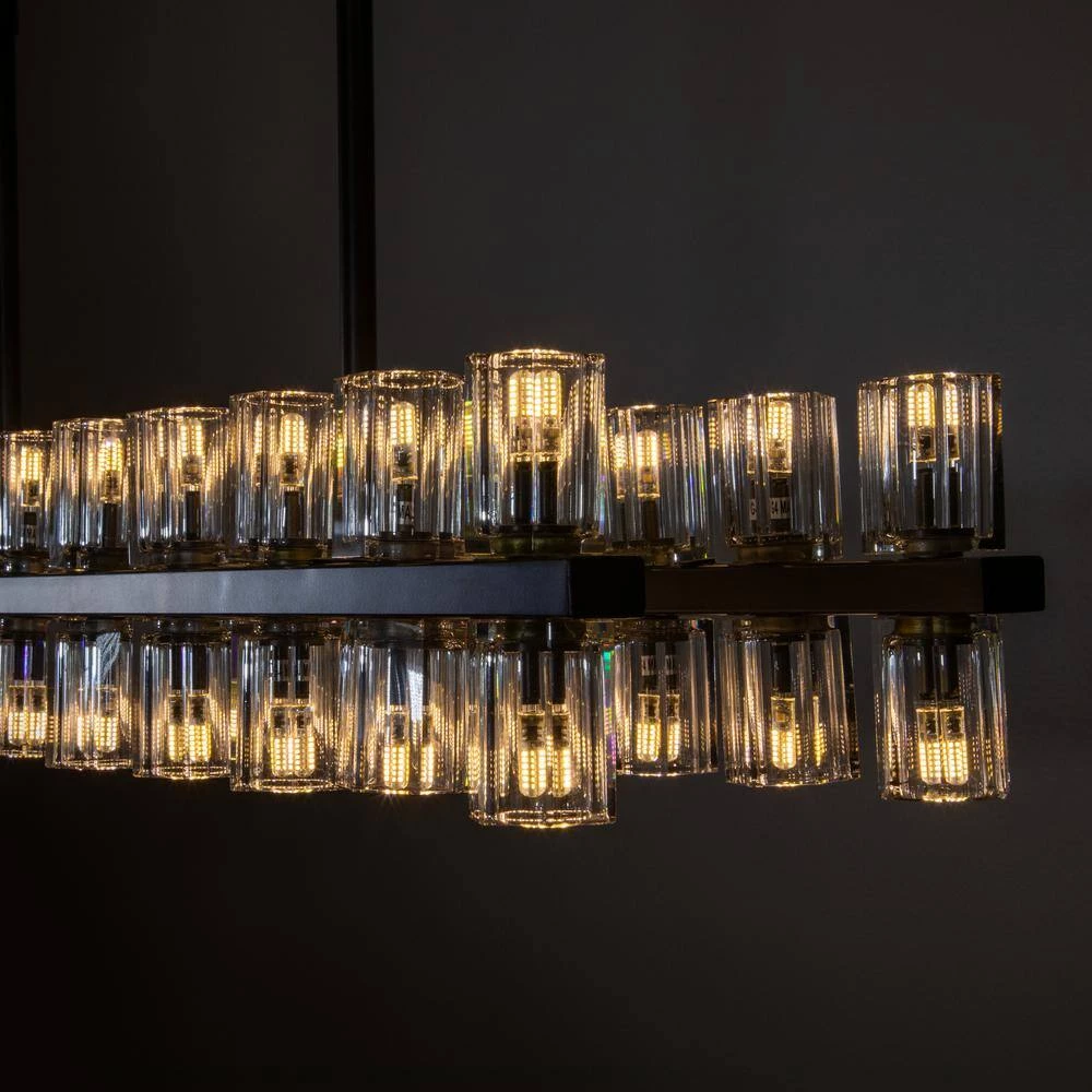 This expansive stunning Gemini Chandelier features a fusion of traditional richness of light reflections and texture with modern simplicity. The 48 ribbed glass micro-shades are arranged on a long rectangular frame, in a way that half of them shines up and another half shines down. Simple and clean frame which is 40 in. L and 9 in. W does not detract from the main showstopper but rather adds accentuating structure. Thanks to its shape Gemini Chandelier would be perfect over a specious kitchen island or large a elongated table either in the dining room or luxury office.