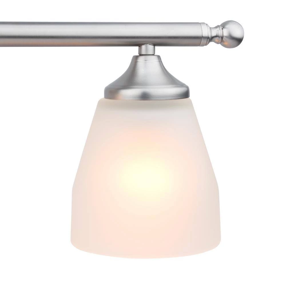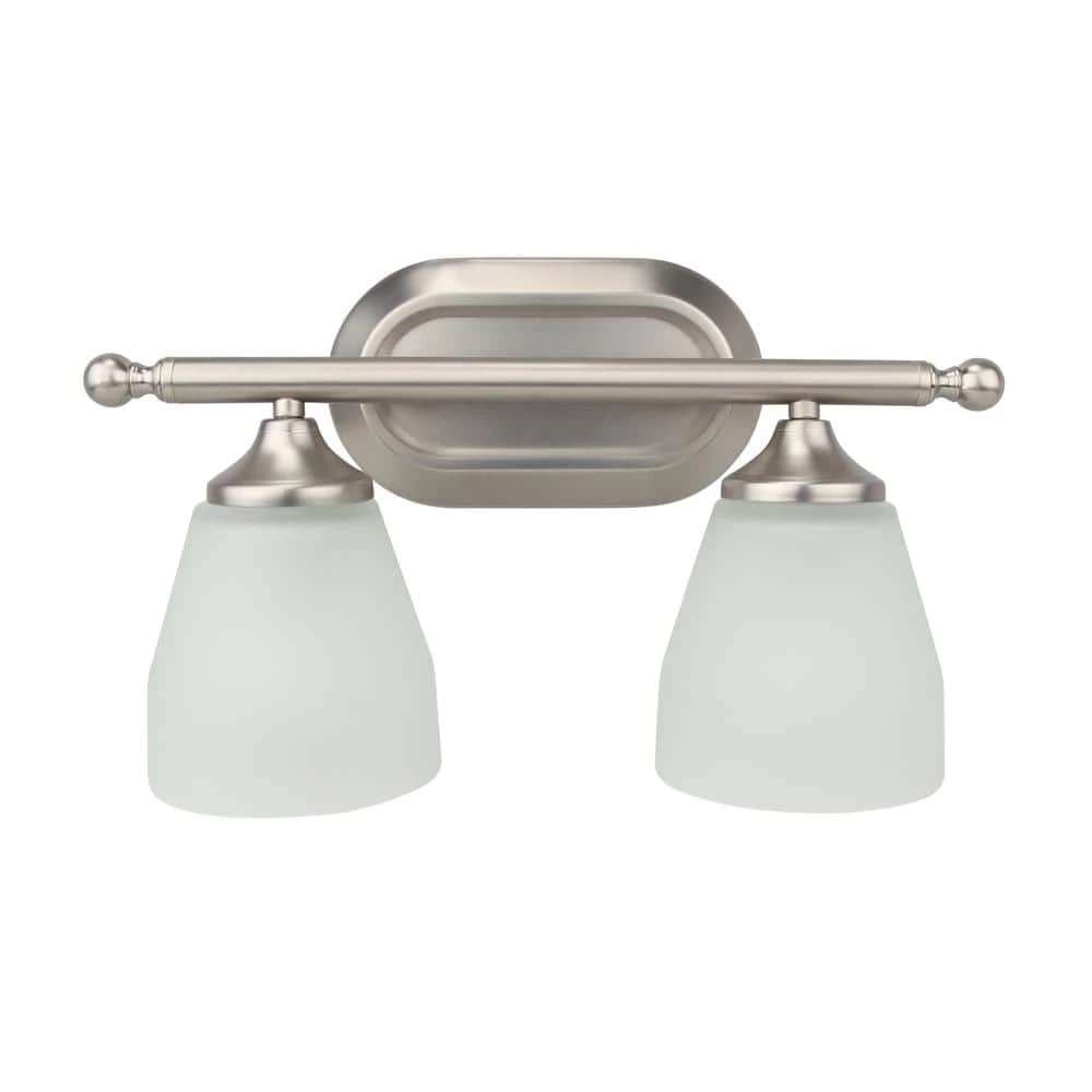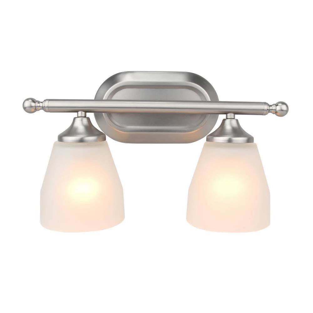 This timeless classic 2-Light vanity light will upgrade the look of your bathroom or powder room. The satin nickel finish is ideal for blending existing bathroom finishes. The frosted white shades allow for soft dispersion of light and are perfect over a single sink vanity. This fixture can be mounted facing upwards or downwards for more directed light.