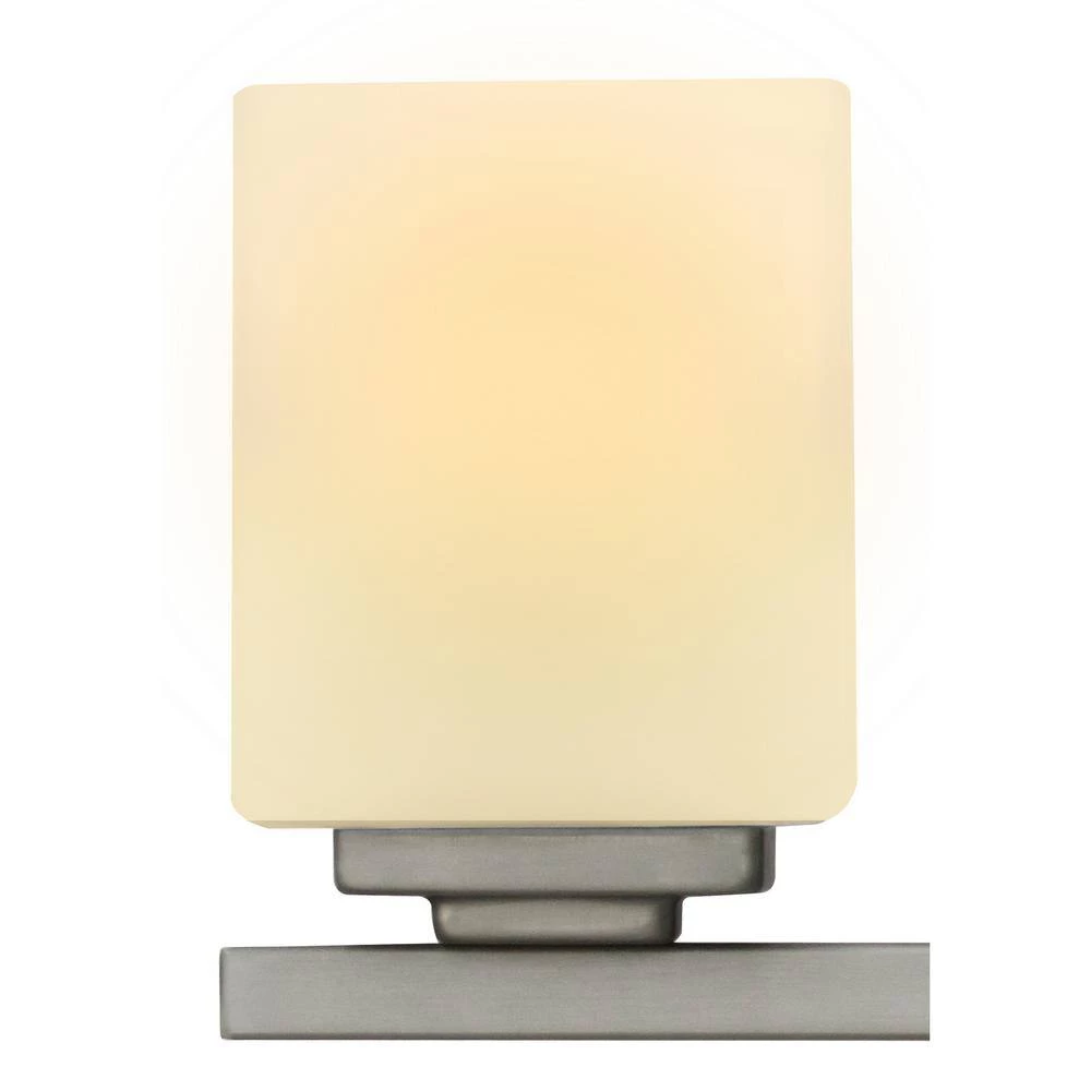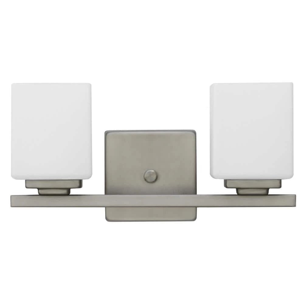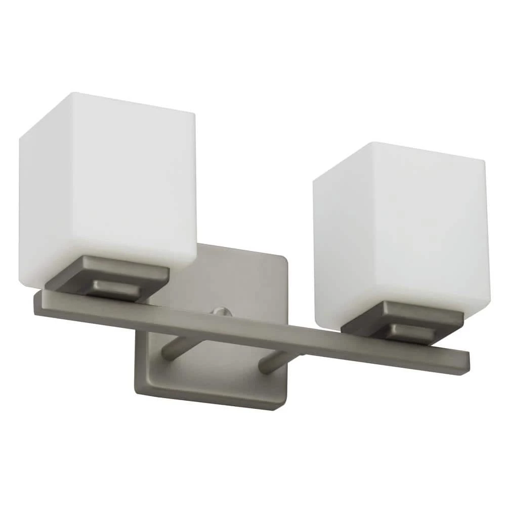 This timeless classic 2-Light vanity light will upgrade the look of your bathroom or powder room. The satin nickel finish is ideal for blending existing bathroom finishes. The frosted white shades allow for soft dispersion of light and are perfect over a single sink vanity. This fixture can be mounted facing upwards or downwards for more directed light.