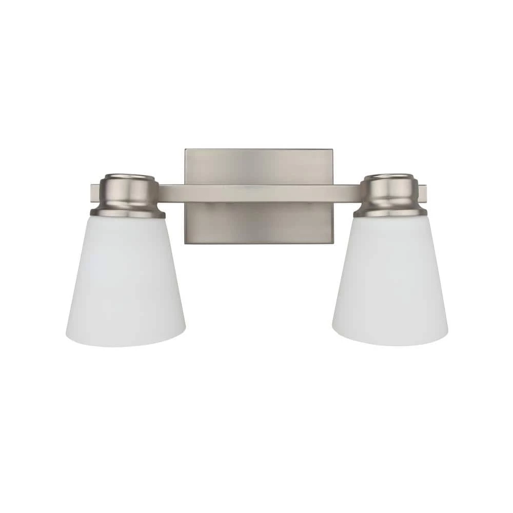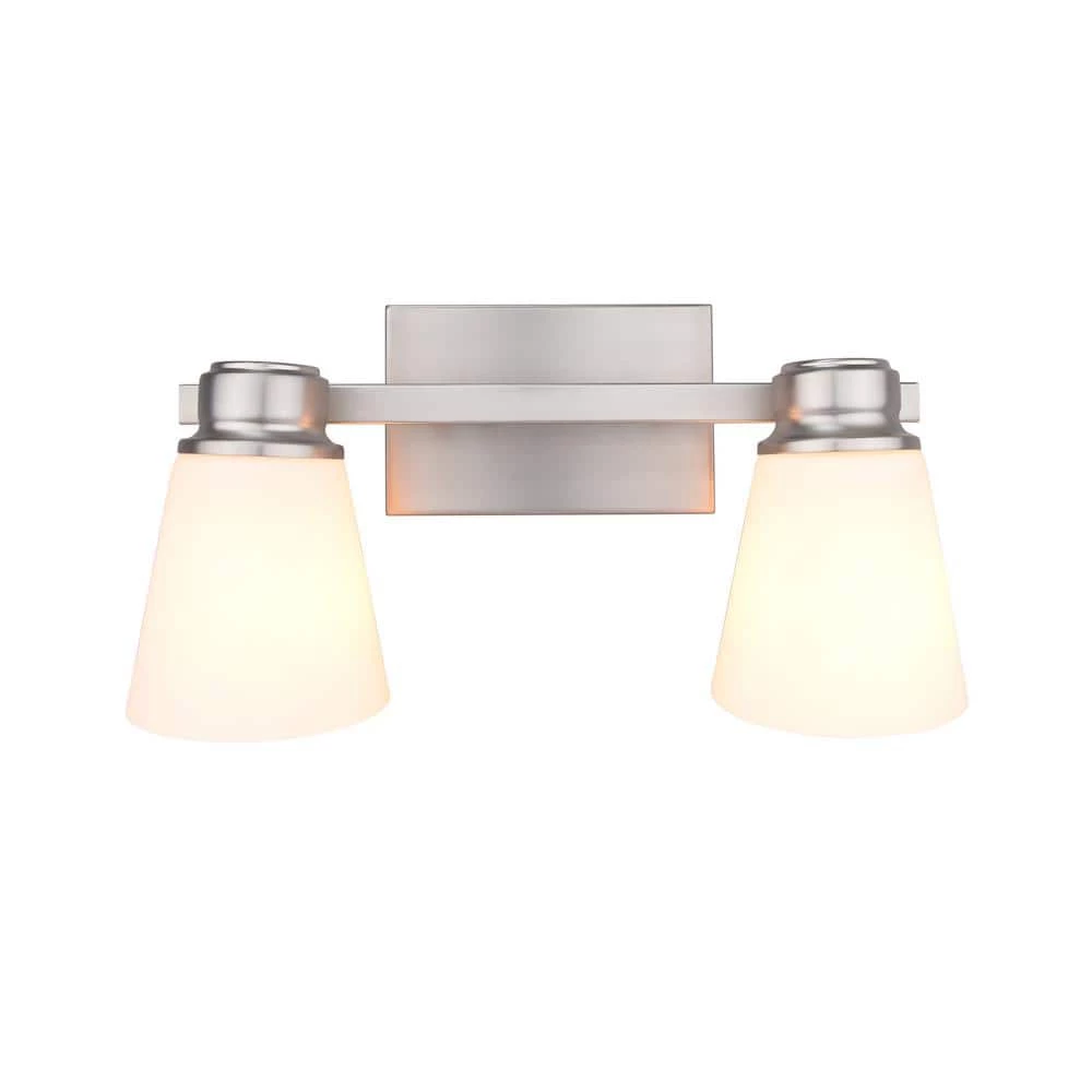 This timeless classic 2-Light vanity light will upgrade the look of your bathroom or powder room. The satin nickel finish is ideal for blending existing bathroom finishes. The frosted white shades allow for soft dispersion of light and are perfect over a single sink vanity. This fixture can be mounted facing upwards or downwards for more directed light.