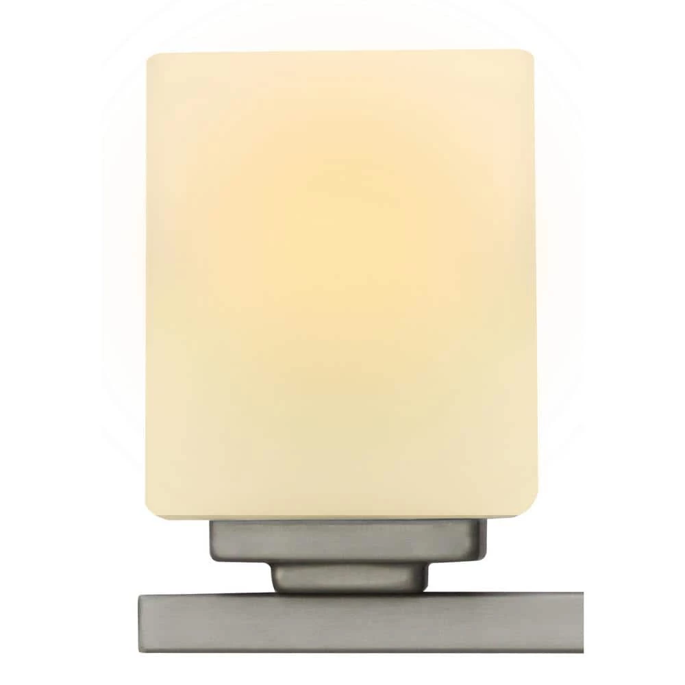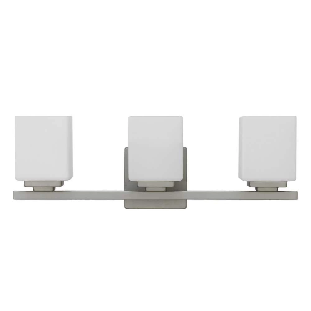 This timeless classic 3-Light vanity light will upgrade the look of your bathroom or powder room. The satin nickel finish is ideal for blending existing bathroom finishes. The frosted white shades allow for soft dispersion of light and are perfect over a single sink or double sink vanity. This fixture can be mounted facing upwards or downwards for more directed light.