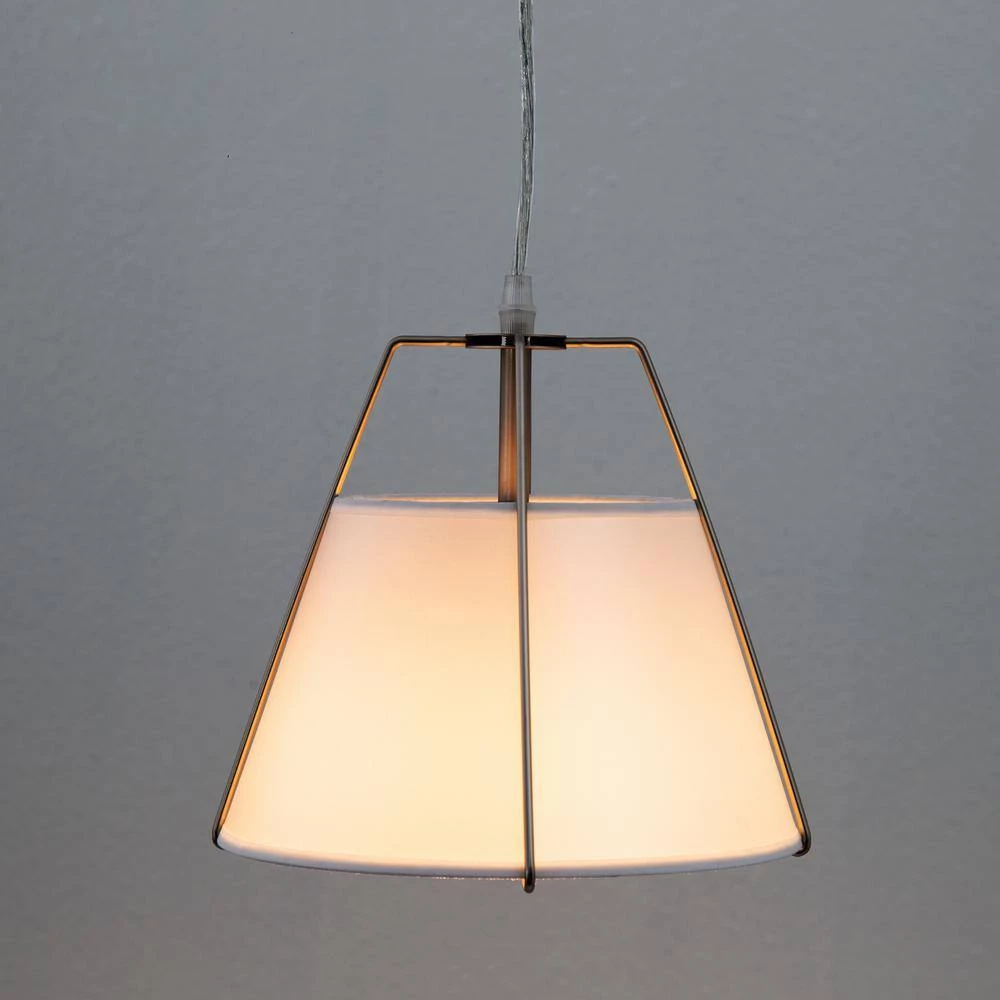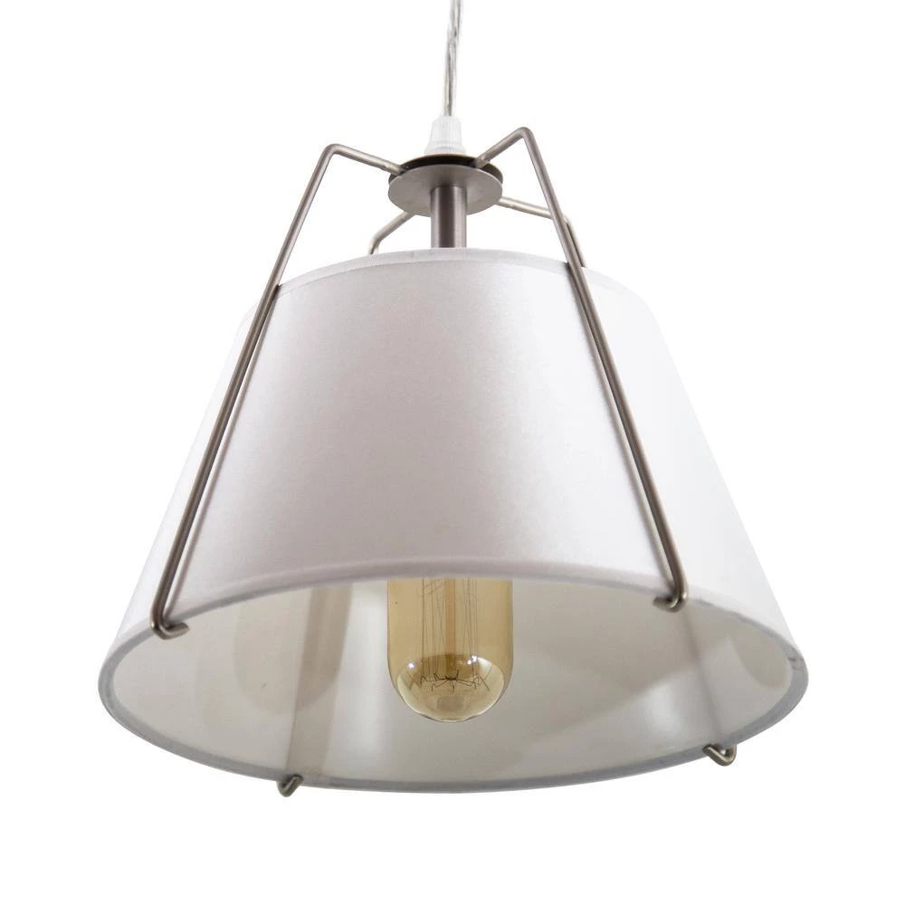 This single light Modern pendant provides a minimalistic yet sophisticated and airy design. The 9 in. tall white shade perfectly compliments the satin nickel frame. Hung with a cord of 120 in. The height can be adjusted to needed height. Canopy in satin nickel finishes the look. Get creative with your design. Use this modern pendant with white shade in the kitchen, over the bedstand or anywhere where soft airy textural component is needed in.