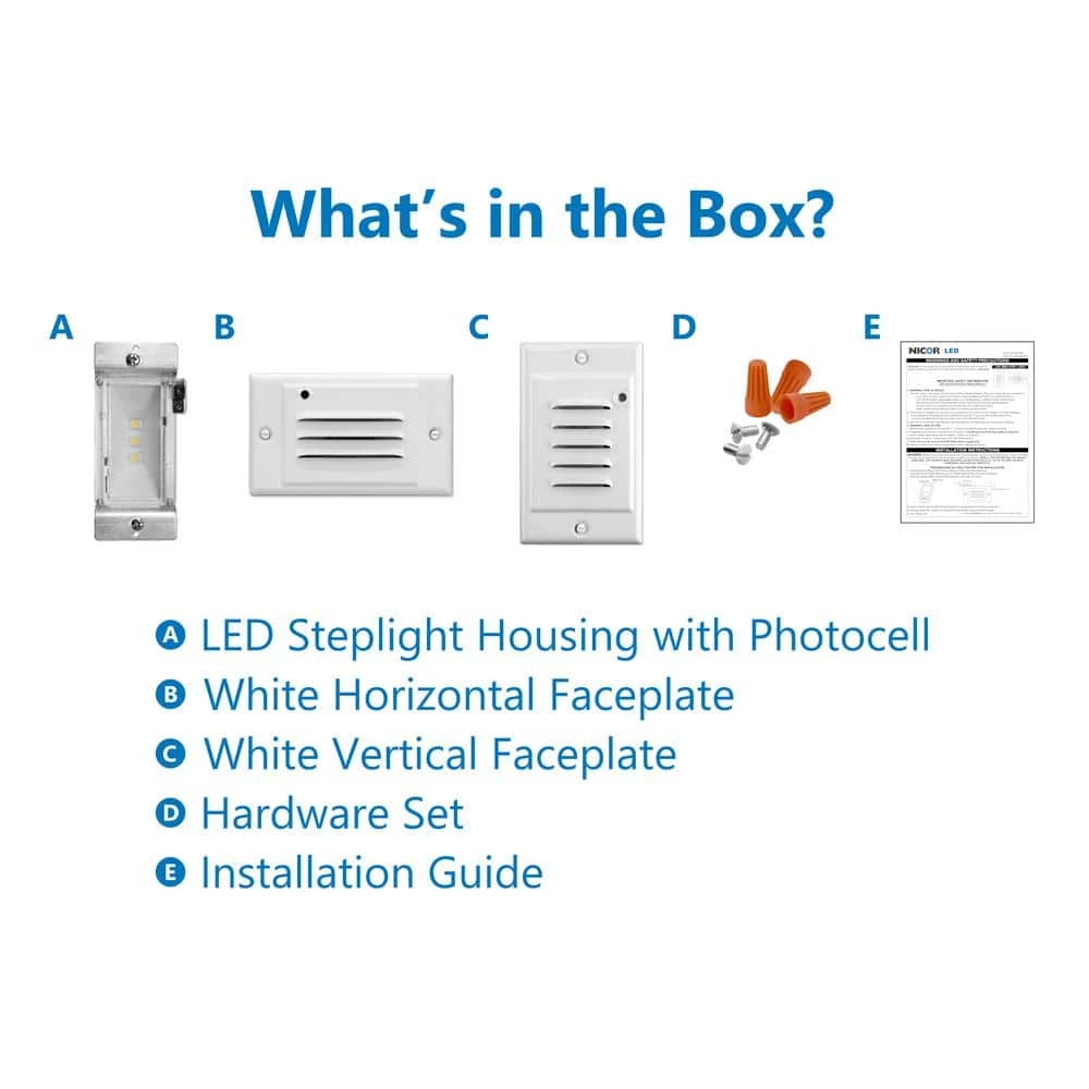 - Includes one LED Step Light with Photocell and two White Faceplates (Vertical and Horizontal)