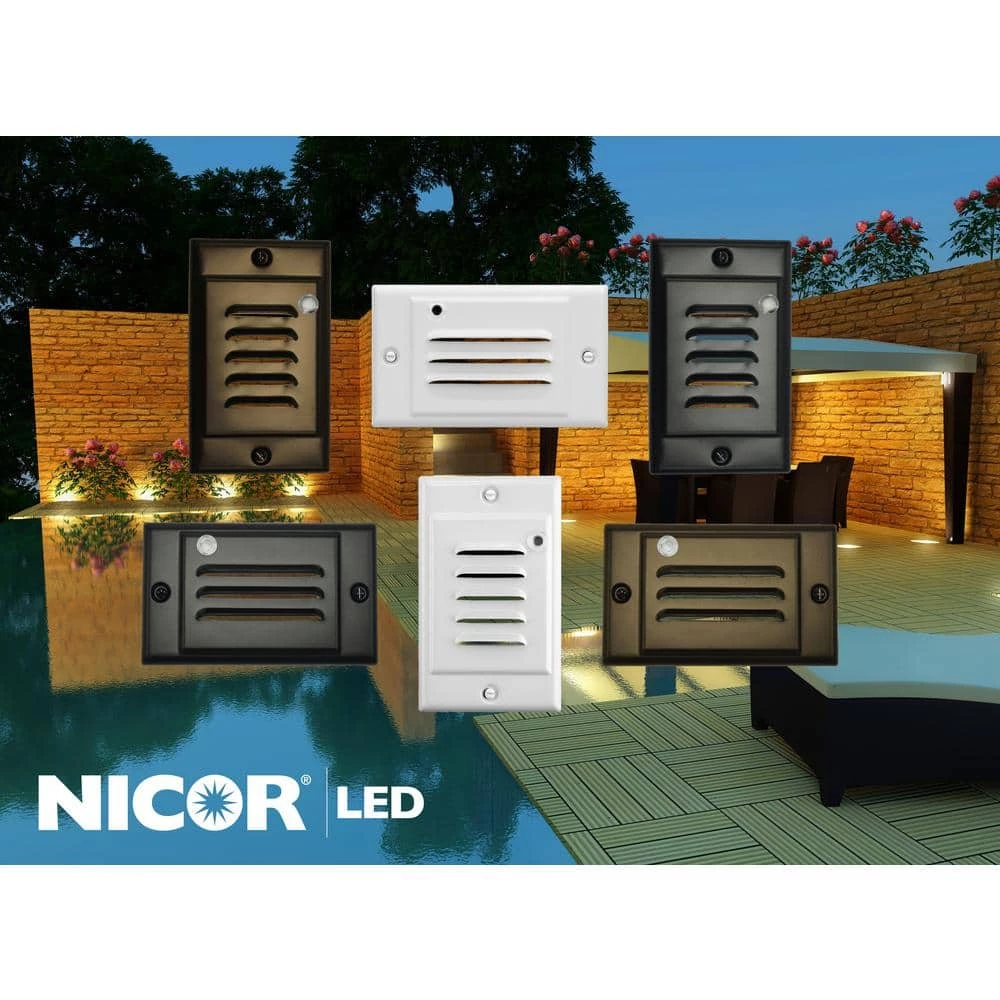 NICOR’s STP Series LED Step Light with built-in Photocell is a great complement to your home or commercial space. This step light not only provides a touch of safety, but it offers a warm, natural glow making it a perfect accent for any project. The built-in Photocell (Dusk-to-Dawn Sensor) automatically turns the Step Light “ON” when it gets dark, and “OFF” when light is present. The LED Step Light uses only 1.2 Watts of electricity and carries a 50,000 hour lifespan. Each Step Light is sealed and approved for use in wet locations, making it perfect for outdoor decks, porches, and pathways. Use it indoors to light up hallways, stairways, or entryways. The LED Step Lights are available with White, Black, and Oil-Rubbed Bronze louvered faceplates in both vertical or horizontal orientations. If you need a specific color, the white faceplates can be painted to match your interior. The Step Light features a warm 2700K color temperature and is covered by NICOR’s 5-year limited warranty.