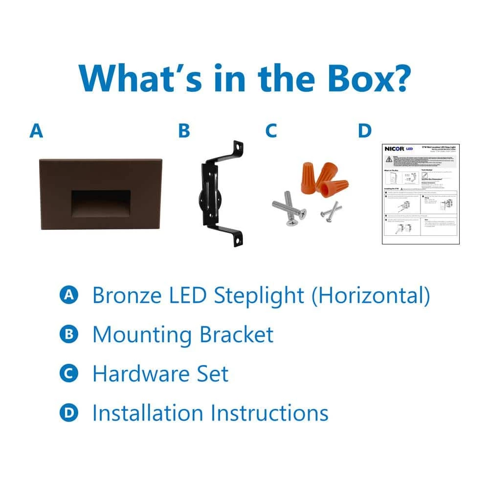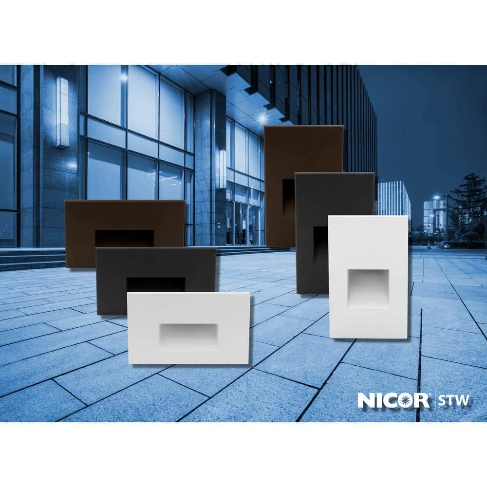 NICOR’s STW Series LED Step Lights are the perfect accent lights for hallways, stairways, porches, patios and outdoor walkways. The LED step lights are available in both vertical and horizontal orientations to fit your space correctly. The sealed wet location rated step lights are perfect for outdoor accent lighting to provide increased safety in dark areas. The louvered design produces soft ambient lighting pointed downwards. The slim profile design allows for easy surface mount installation, using standard line voltage hardwiring. The STW LED step light features a 3000K color temperature and is available in Matte Black, Bronze and White finishes. All LED fixtures are protected by NICOR’s 5-year limited warranty.
