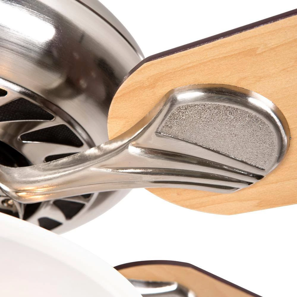 Ensure a cool breeze for a relaxing indoor ambiance with this five-blade beautifully designed fan from Yosemite Home Decor. The Whitney ceiling fan offers a classic look while featuring a brushed nickel finish that will work with a variety of different decors. The 52 in. ceiling fan comes with a light kit featuring a beautifully frosted alabaster glass shade. A traditional maple finish adorns each blade, pull chain switches allow for manual power off/on, light, and a three-speed reversible motor, allows you to control air circulation and movement to suite your room needs. This item requires it to be hardwired during installation.